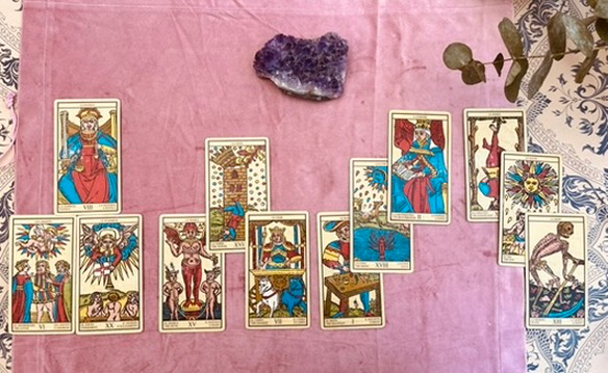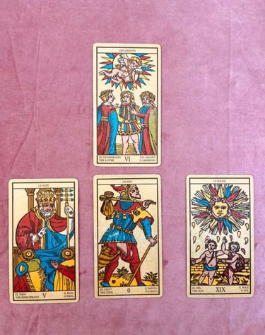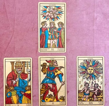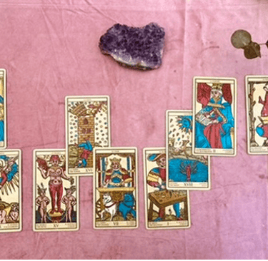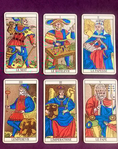 Te invito a seguirme a lo largo de este maravilloso viaje para descubrir la historia del tarot de Marsella, sus 22 arcanos mayores, sus 56 arcanos menores y empezar a practicar y profundizar cada tirada con empatía e intuición.