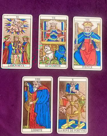 Los Enamorados, el Carro, la Justicia, el Ermitaño y la Rueda de Fortuna.