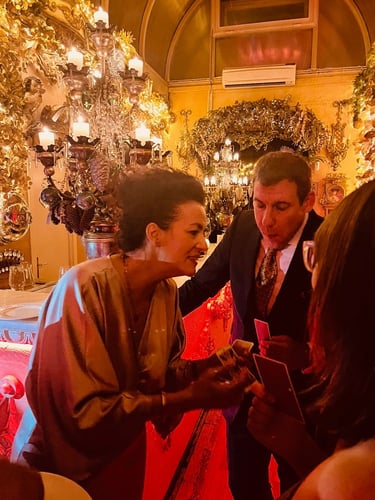 La “Magic Card”, para eventos con muchos invitados, genera una dinámica intrigante y divertida en la que me acerco a las mesas (si ya están cenando) o me paseo entre los grupos (durante el cóctel) para ofrecerles a cada uno la oportunidad de elegir “su carta del día”, que comento brevemente. ¡Ambiente y diversión asegurados!